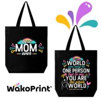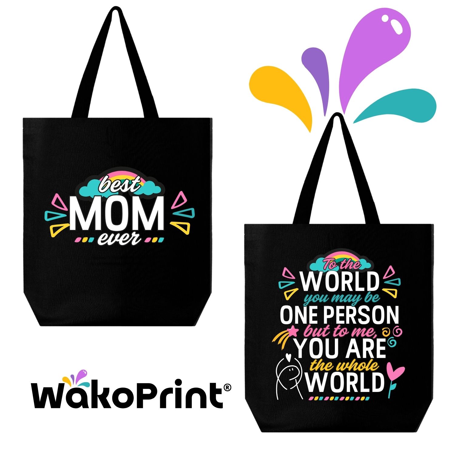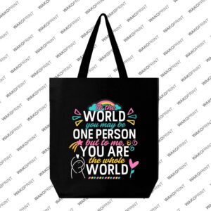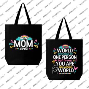 Celebrate the amazing women in your life with this Best Mom Ever Tote Bag, featuring a vibrant double-sided design. One side displays “Best Mom Ever” in cheerful colors, while the other carries the touching quote: “To the world you may be one person, but to me you are the whole world.”