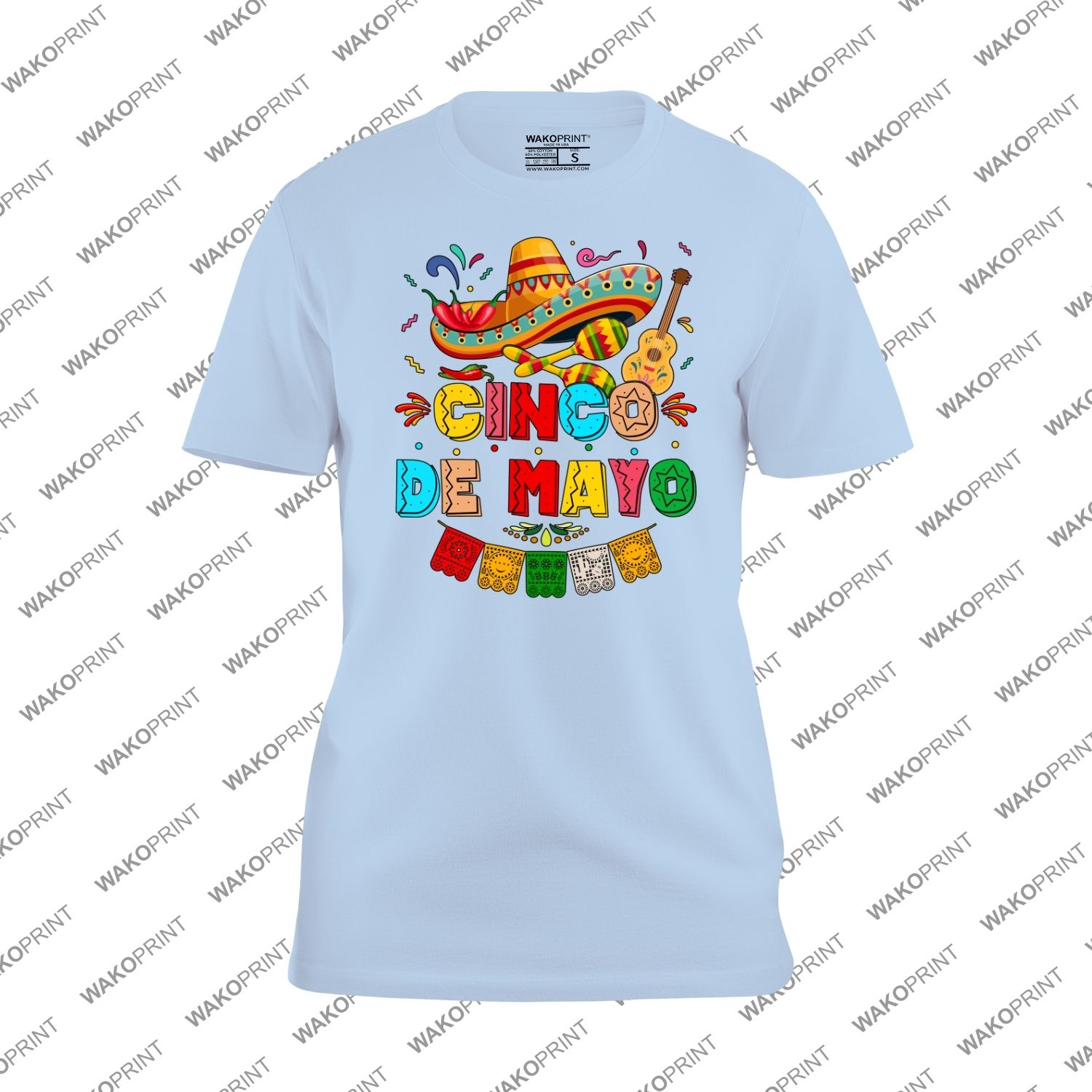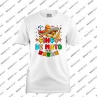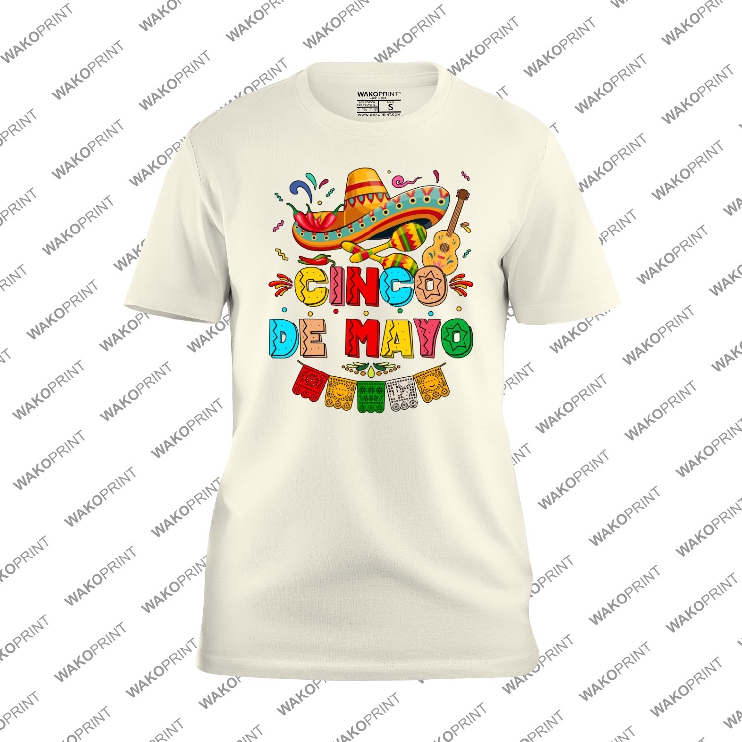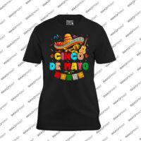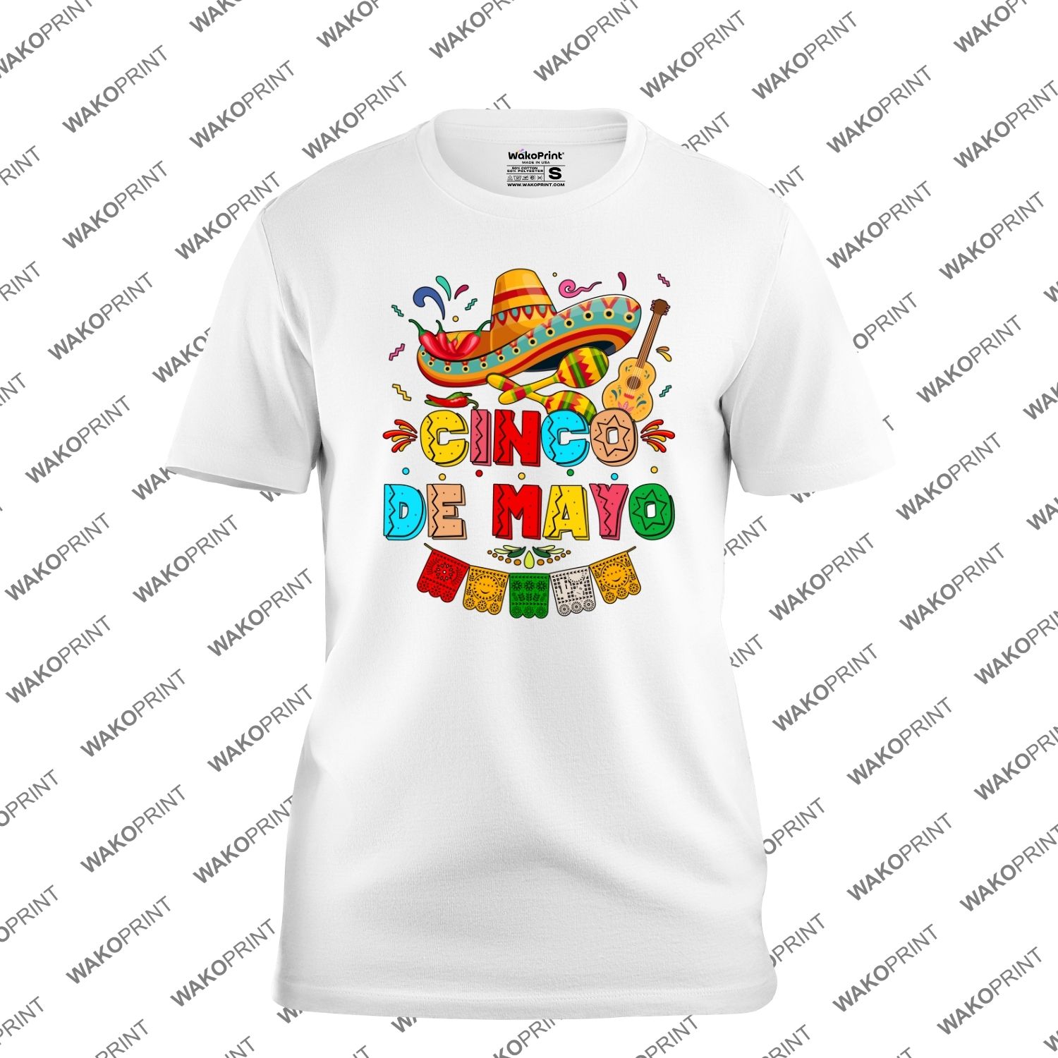 Celebrate Cinco de Mayo with this vibrant fiesta inspired graphic shirt featuring colorful Cinco de Mayo lettering, traditional sombrero illustration, guitar, chili peppers and festive papel picado banner details. Designed for fun celebrations, cultural events and family gatherings.