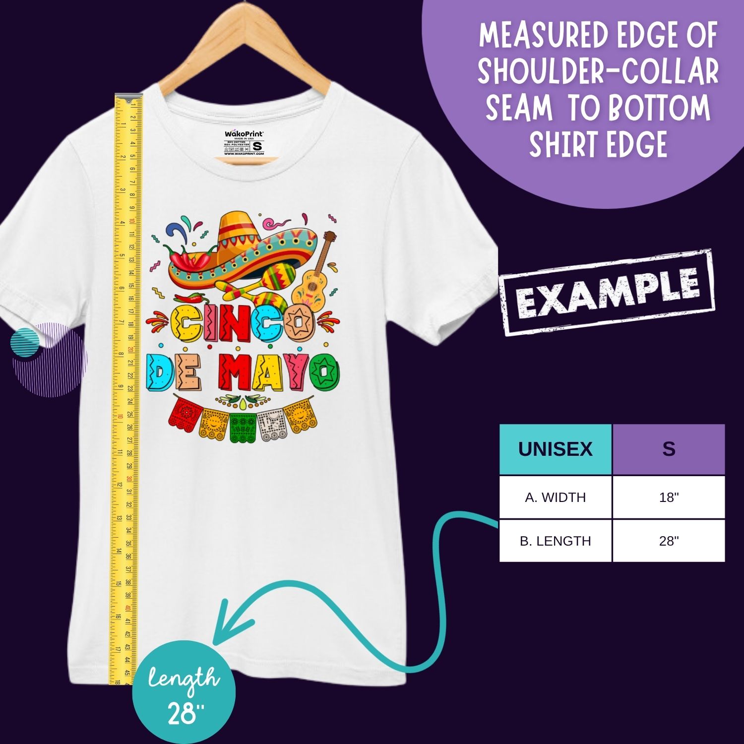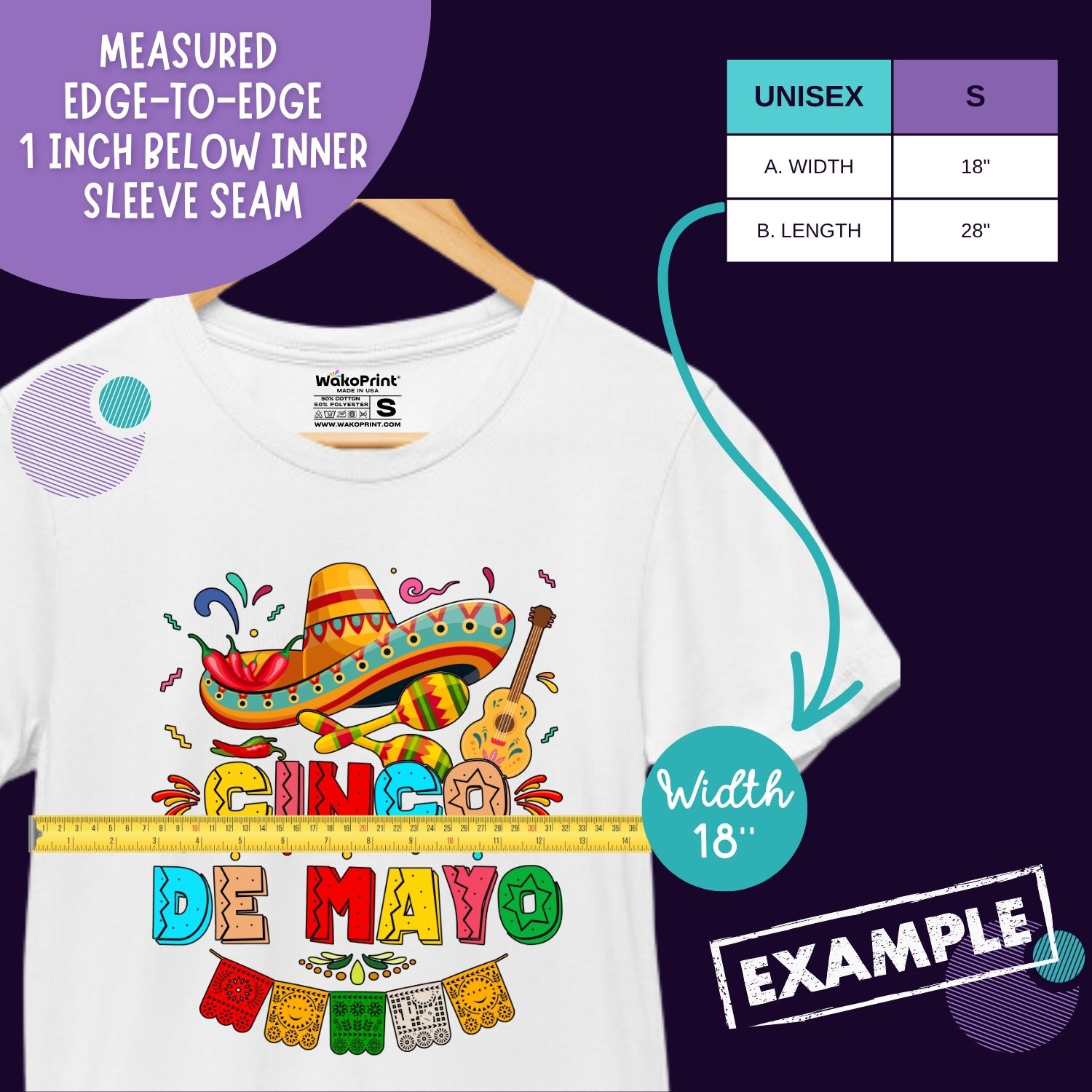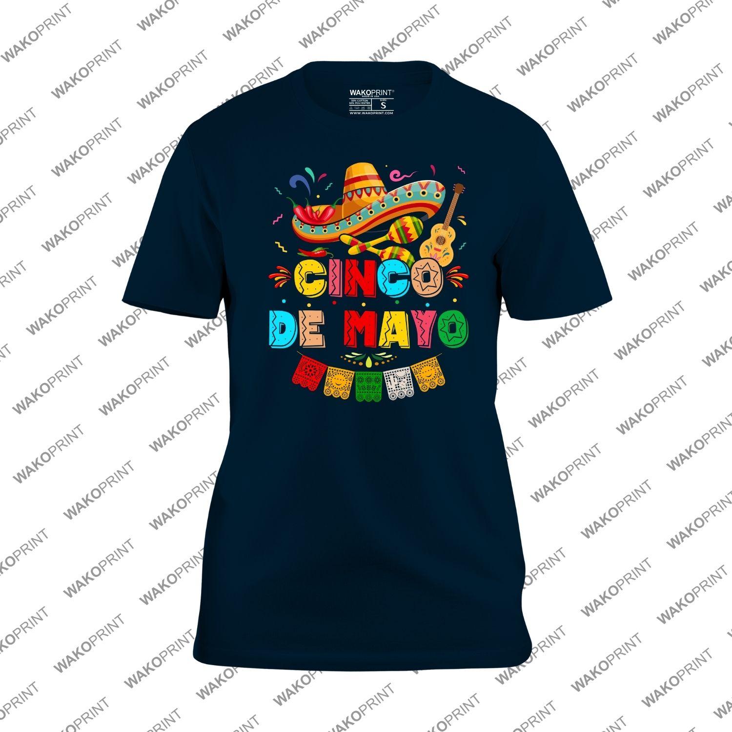 Celebrate Cinco de Mayo with this vibrant fiesta inspired graphic shirt featuring colorful Cinco de Mayo lettering, traditional sombrero illustration, guitar, chili peppers and festive papel picado banner details. Designed for fun celebrations, cultural events and family gatherings.