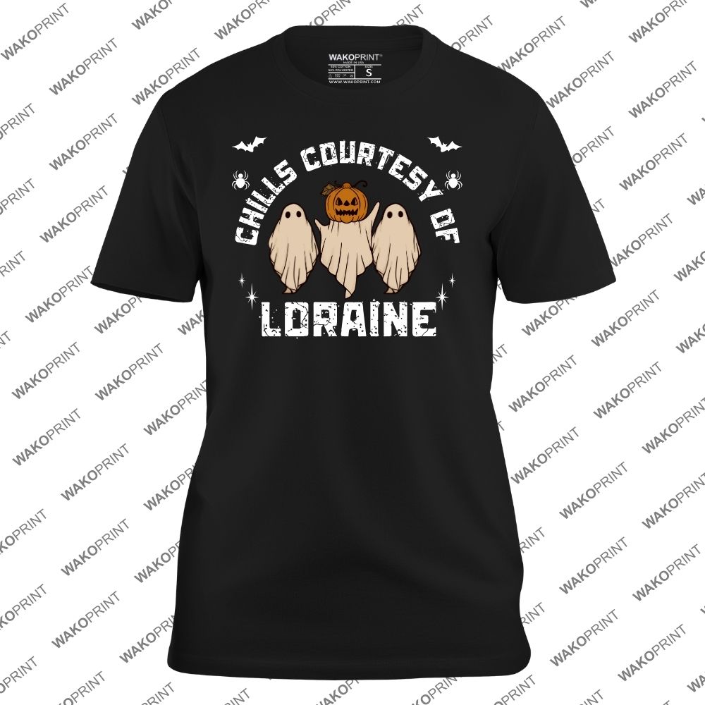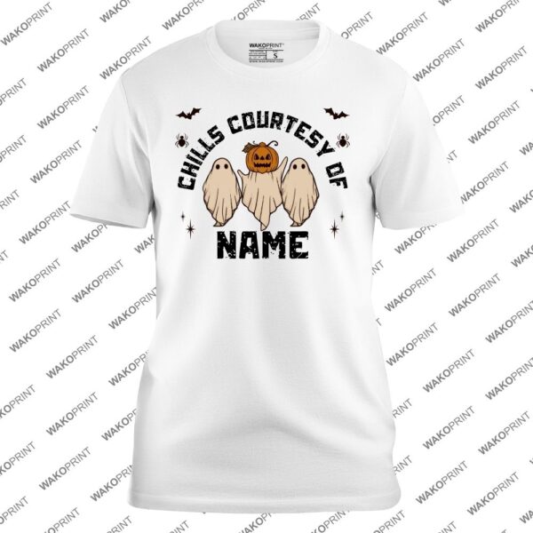 Home Holidays & Celebrations Halloween Custom Halloween Shirt – Chills Courtesy of [Name] | Funny Ghost & Pumpkin Personalized Tee