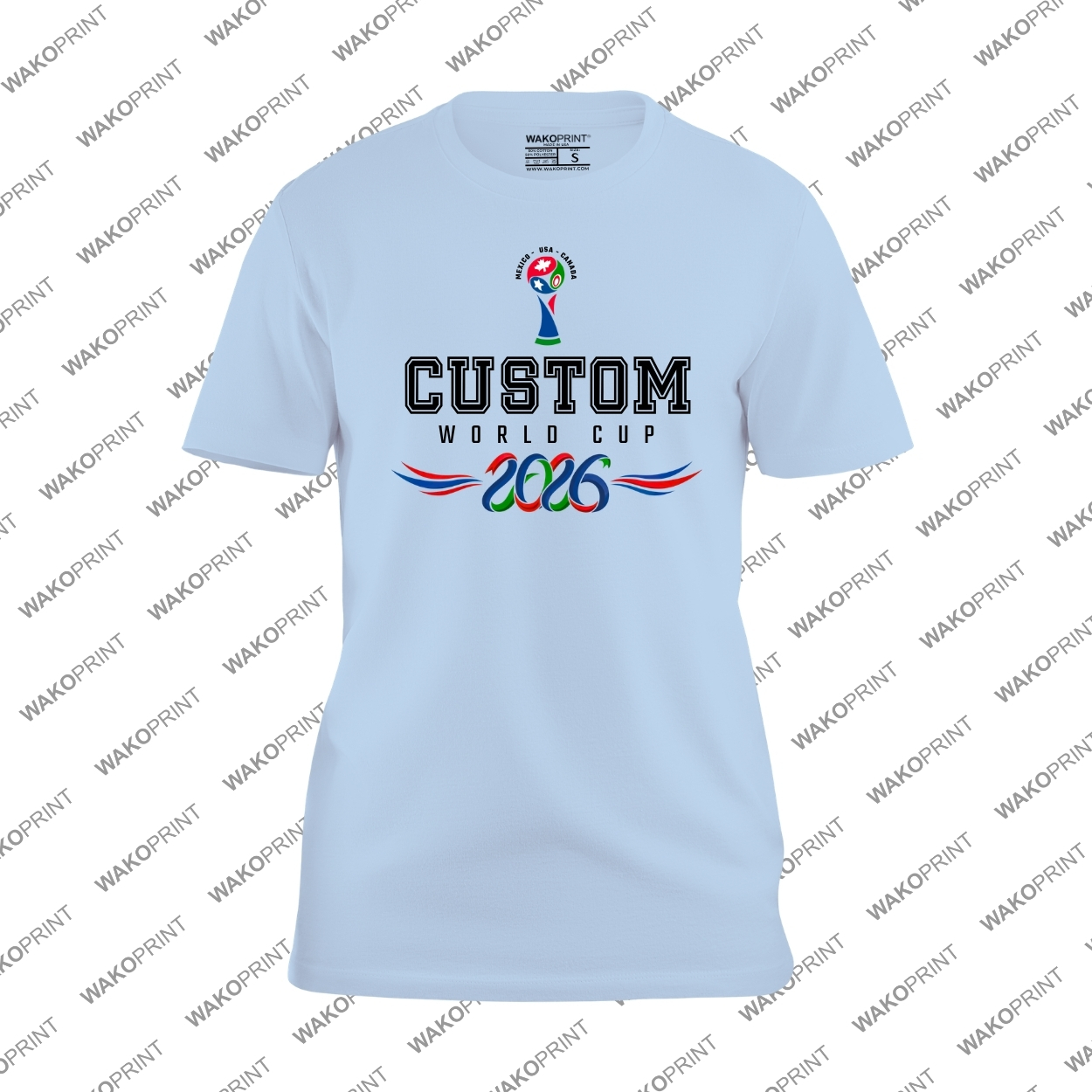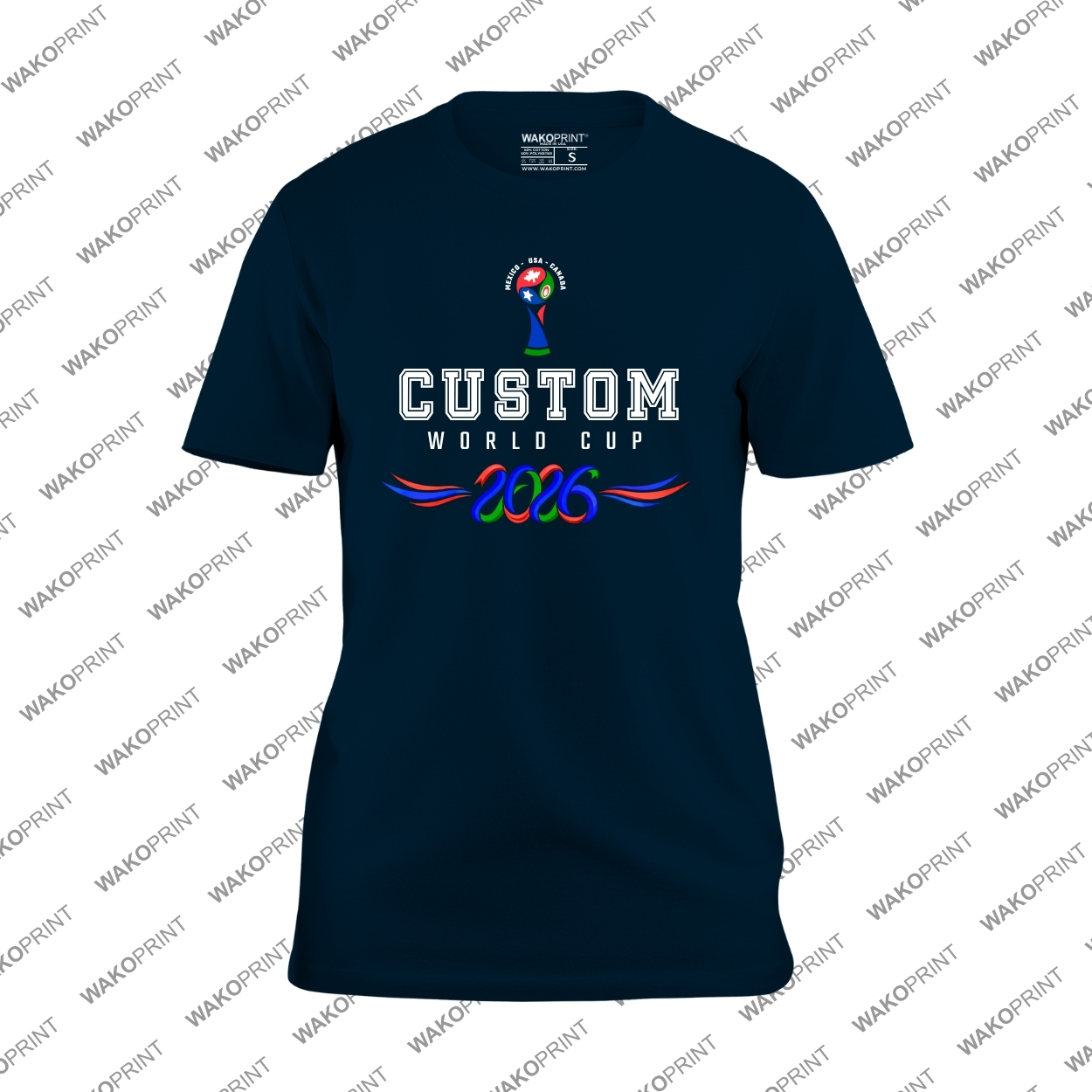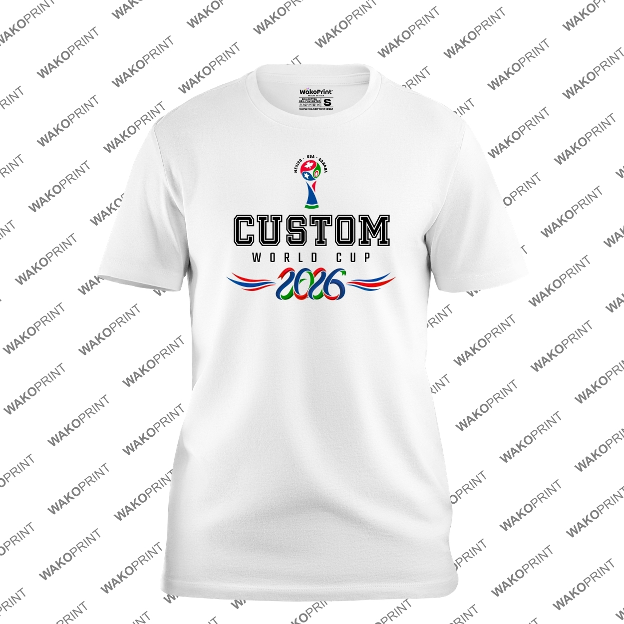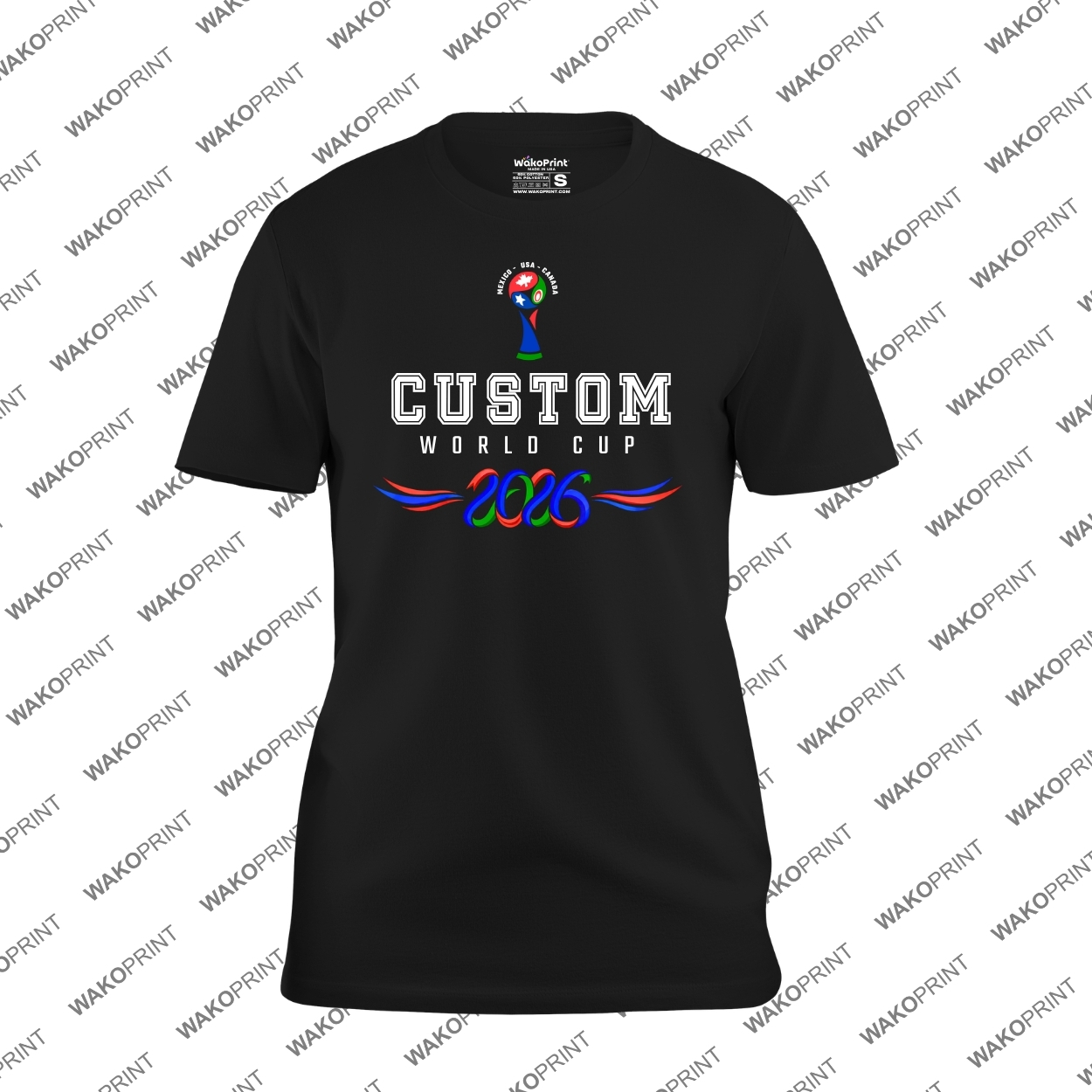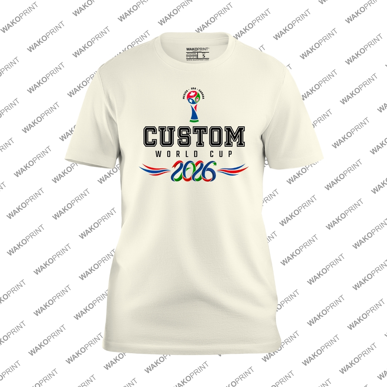 Create your own unique soccer fan shirt with this Custom Text World Cup 2026 design featuring bold lettering and a championship inspired trophy graphic. Perfect for representing any country during the 2026 international soccer tournament.