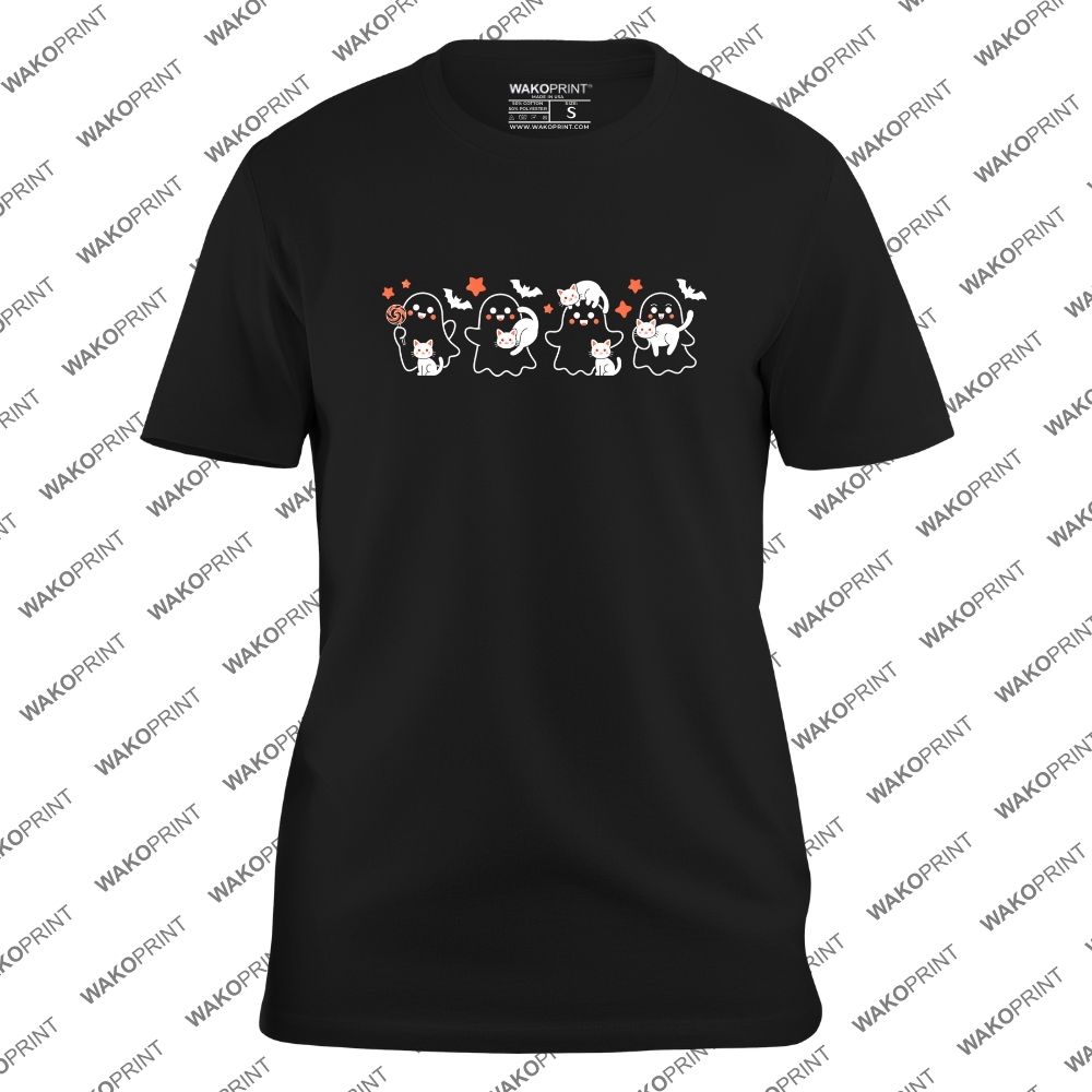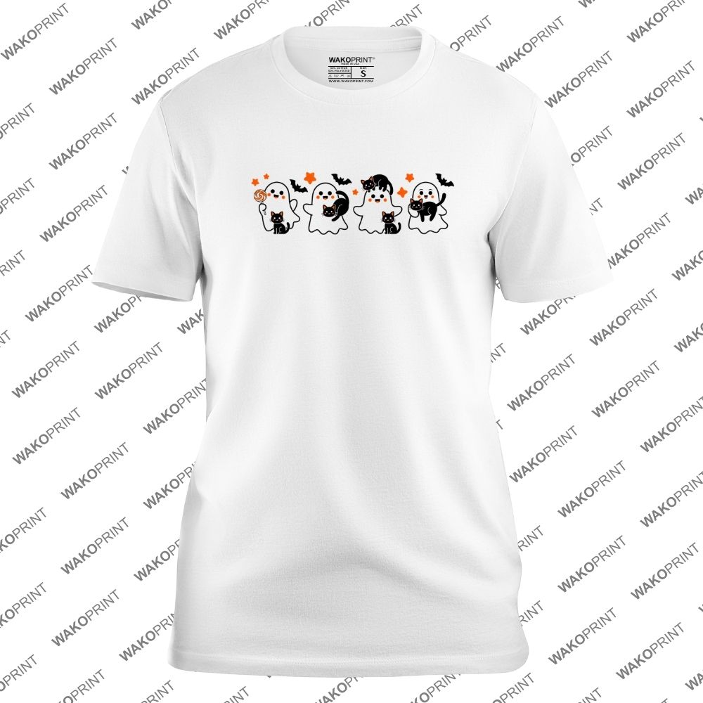Cute Ghosts and Cats Halloween T-Shirt – Funny Spooky Cat Lover Shirt, Kawaii Ghost Kitty Graphic Tee for Women & Kids