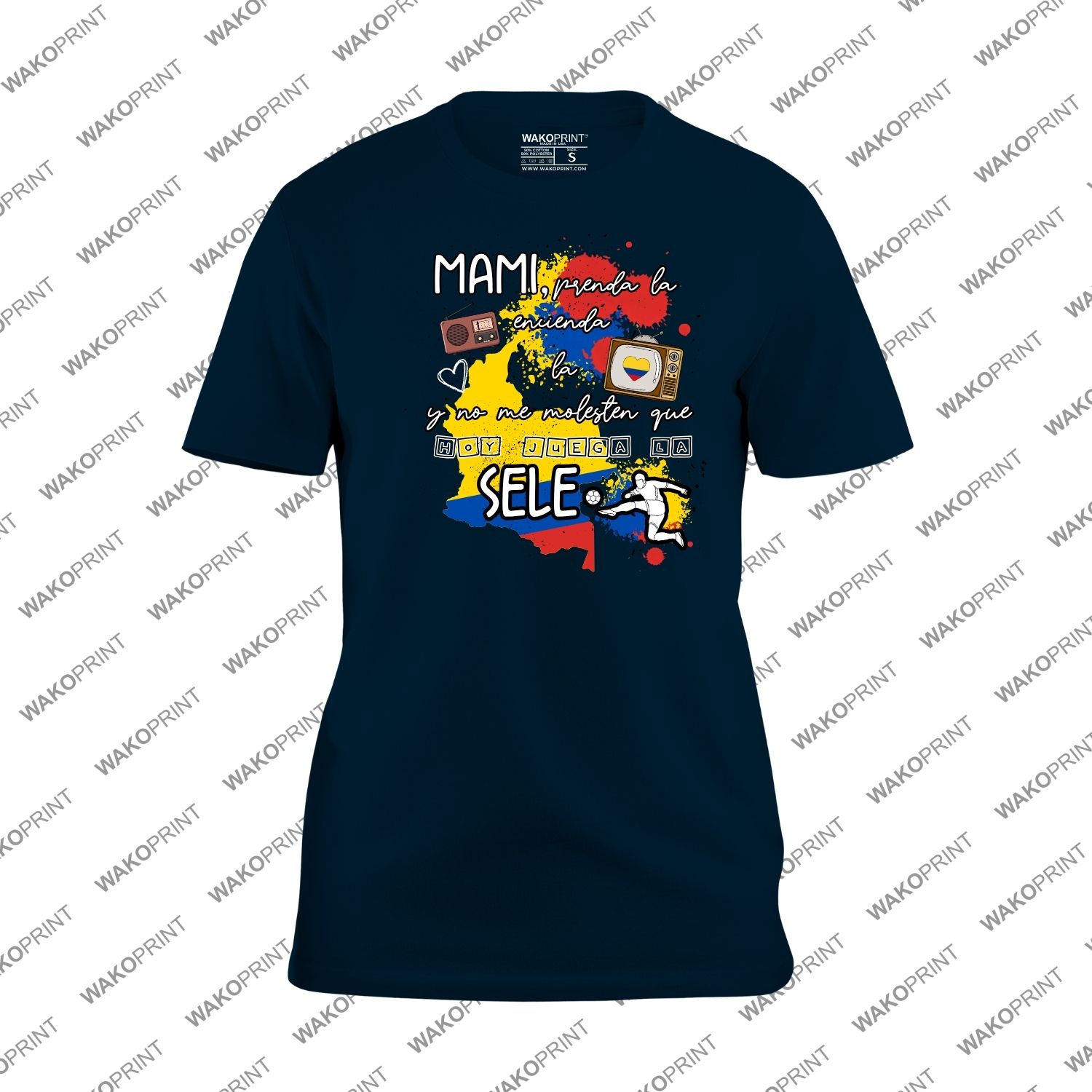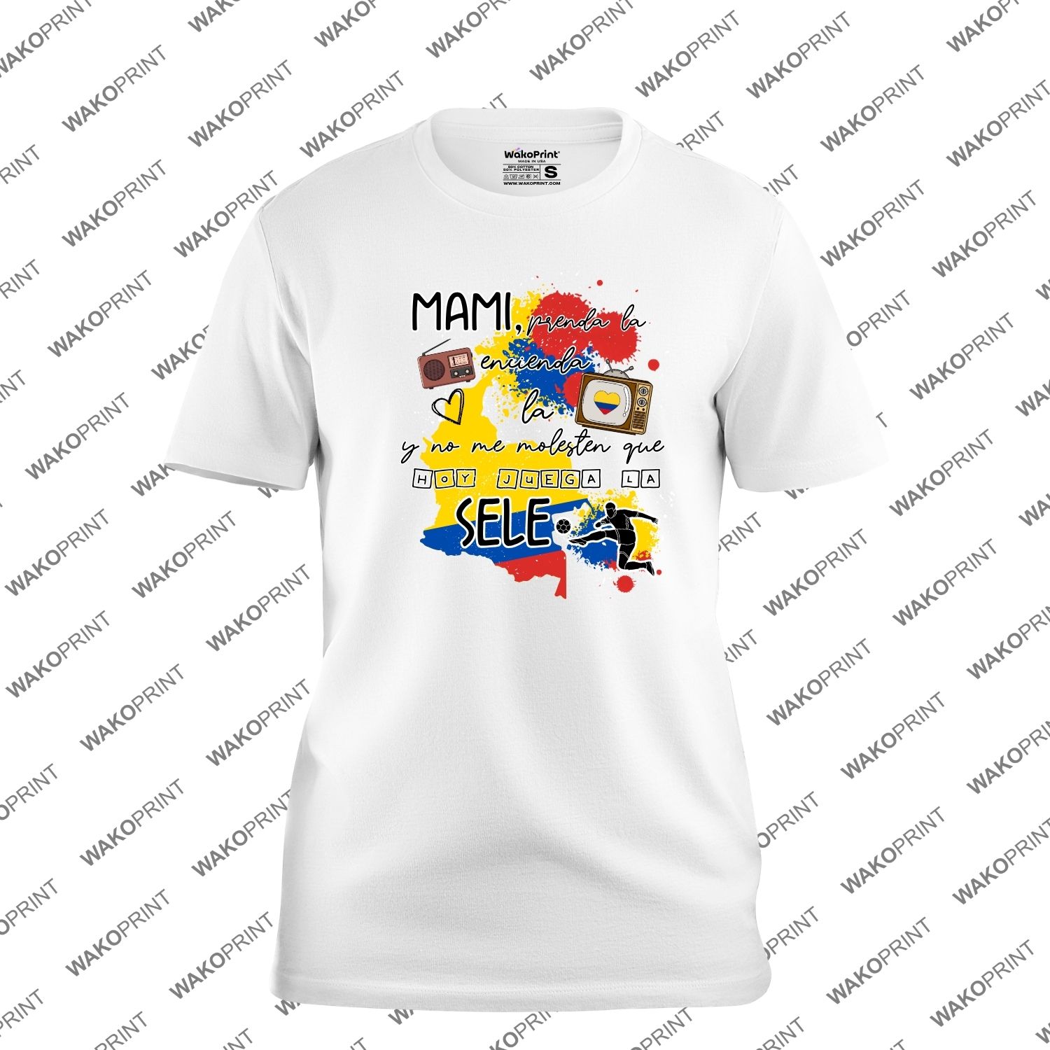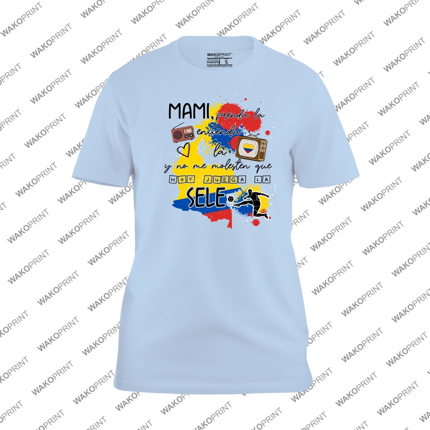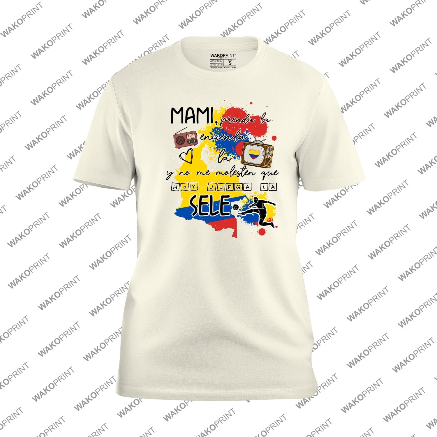 Soccer fan shirt featuring the bold phrase Enciende la radio prende la tele y no me molesten que hoy juega la sele with a vibrant Colombia inspired color splash design. Perfect for tournament season celebrations watch parties and game day gatherings.