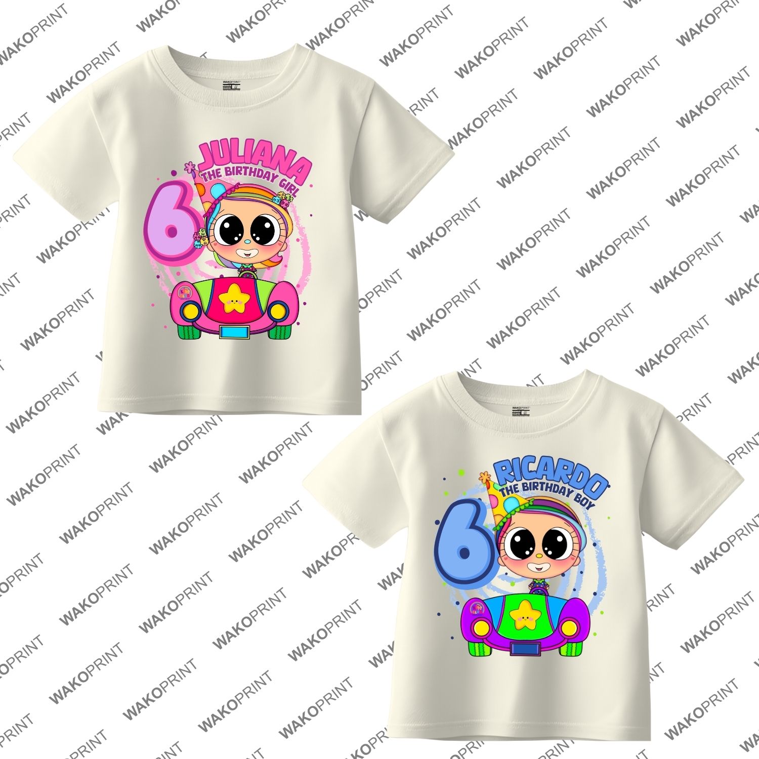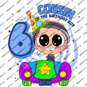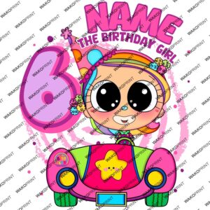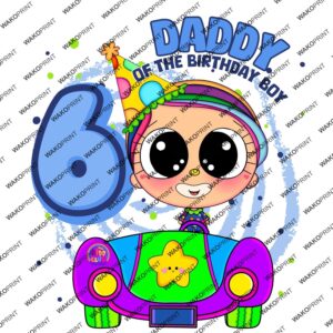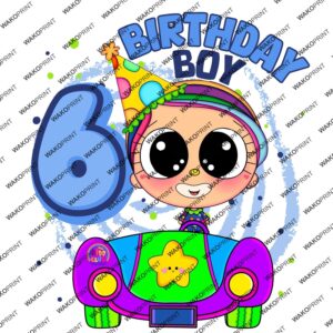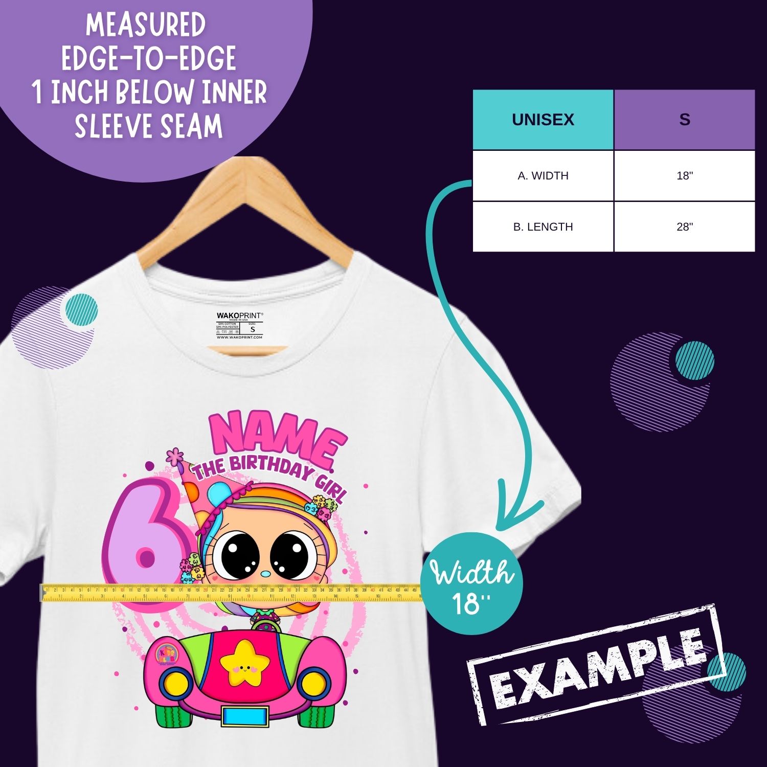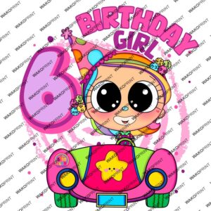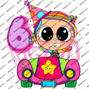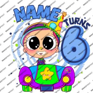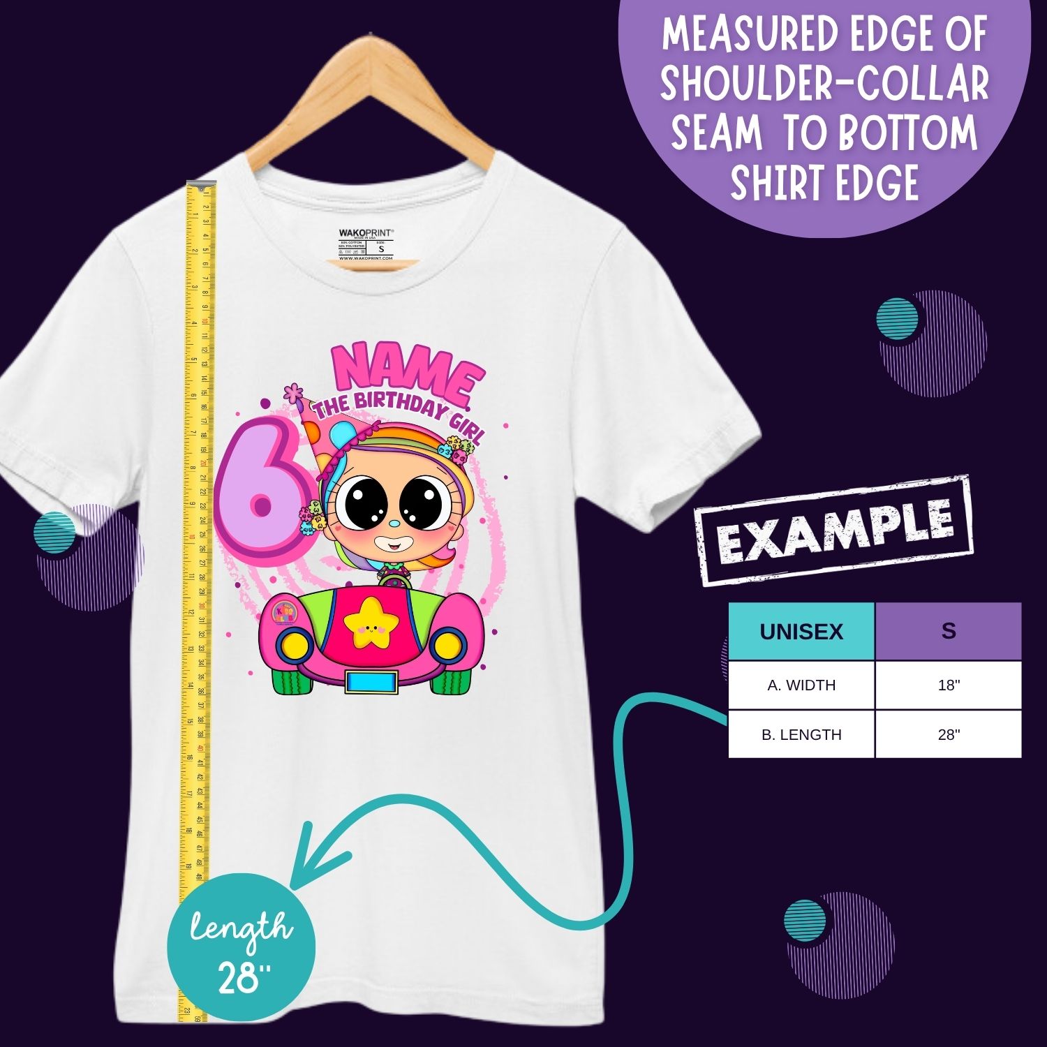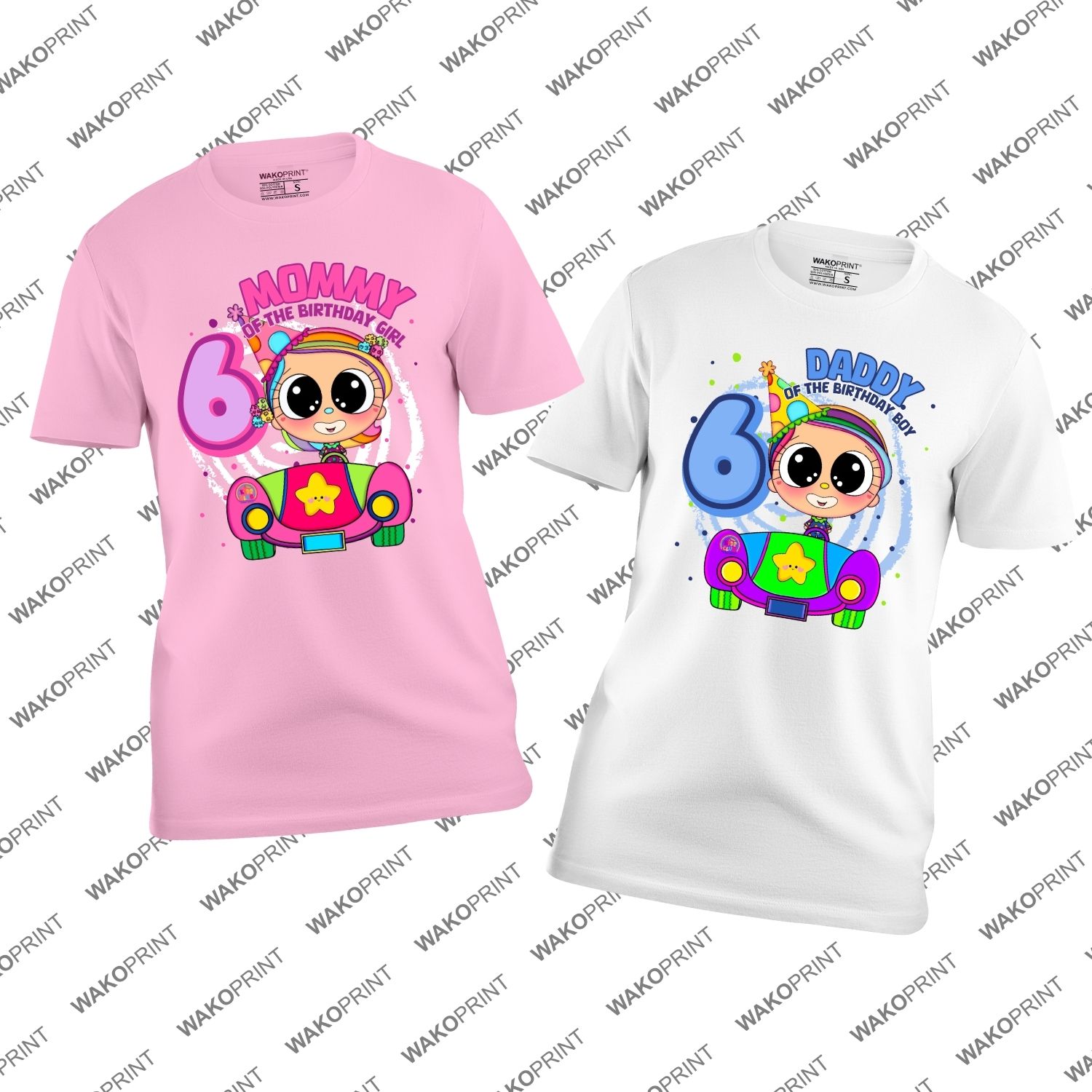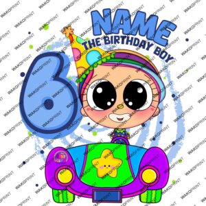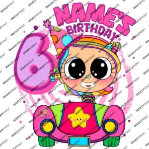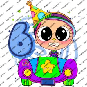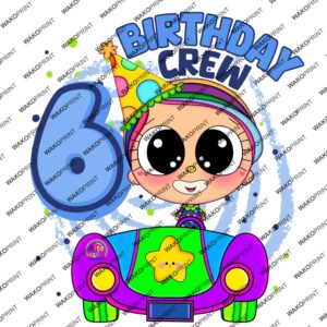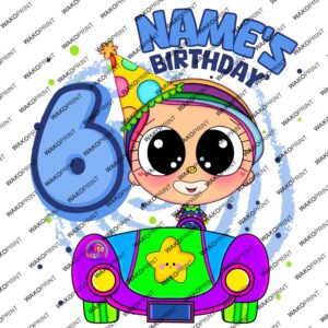 Celebrate a special 6th birthday with this personalized shirt designed for all ages. Featuring a fun cartoon-style character riding a colorful car, this design is perfect for kids, teens, and adults who want to join the celebration. Customize the name on the front and add optional text on the back for a unique and memorable outfit. Made with soft and comfortable fabric, ideal for parties, photos, and keepsakes. Available in multiple colors and sizes from baby 6 months to adult 4XL, perfect for matching family outfits.