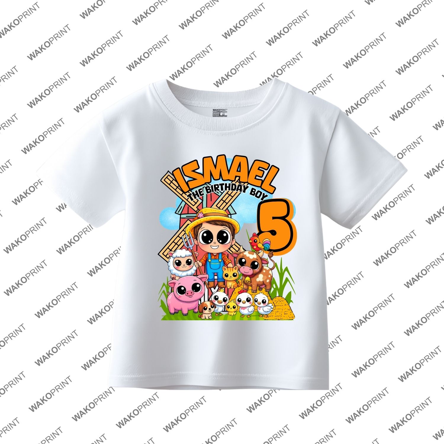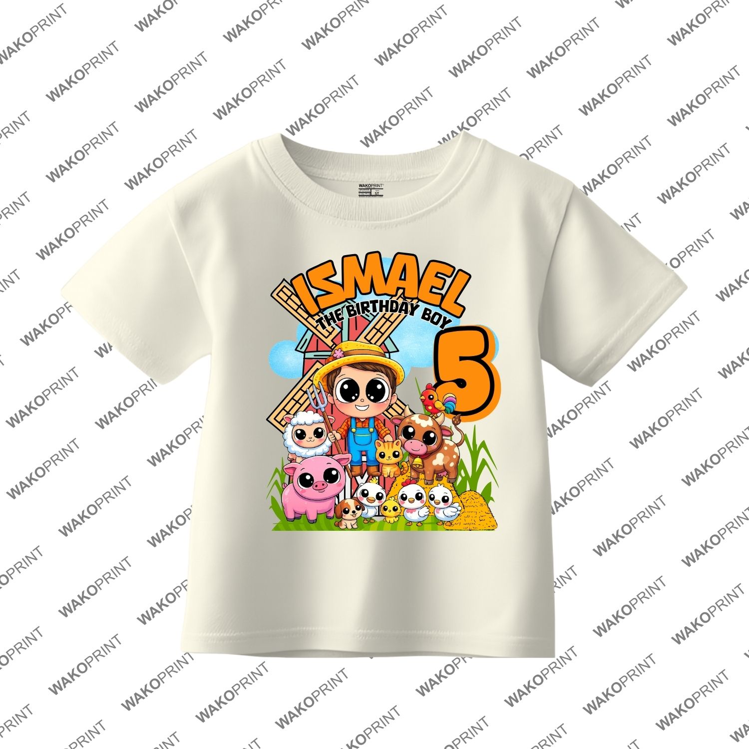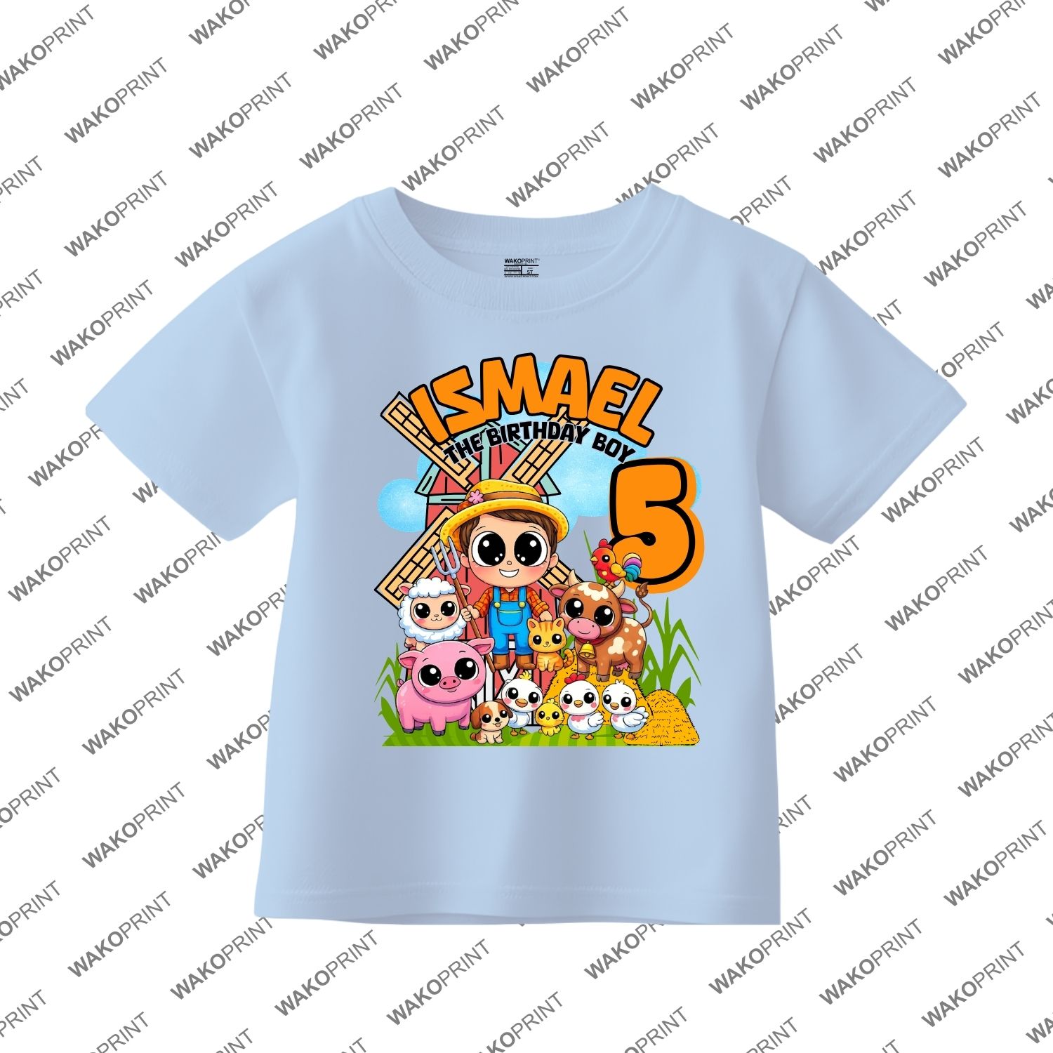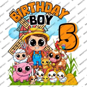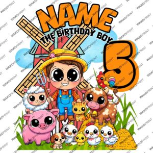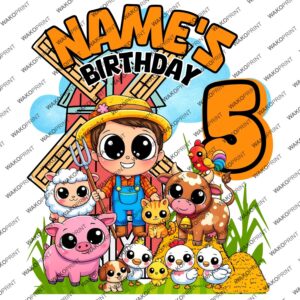 Celebrate your little one with this adorable farm themed birthday shirt featuring a cute birthday boy design surrounded by farm animals including pig cow sheep chicks and barnyard details. The shirt includes a custom name and age on the front, making it perfect for a farm birthday party celebration.