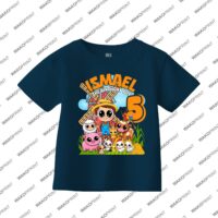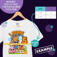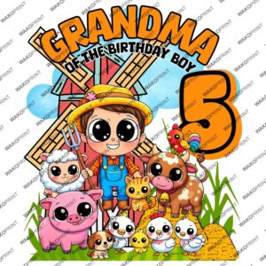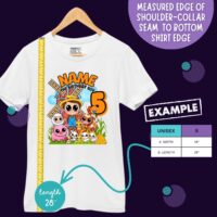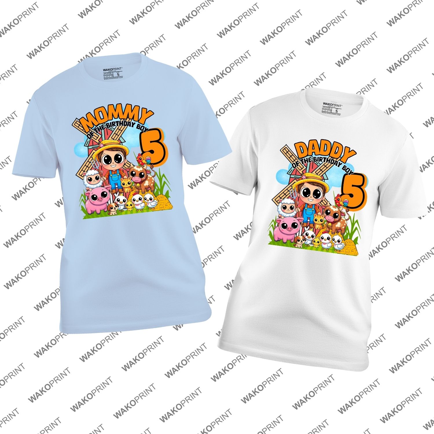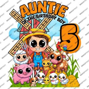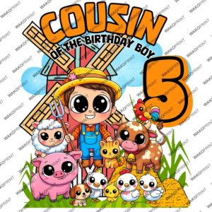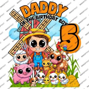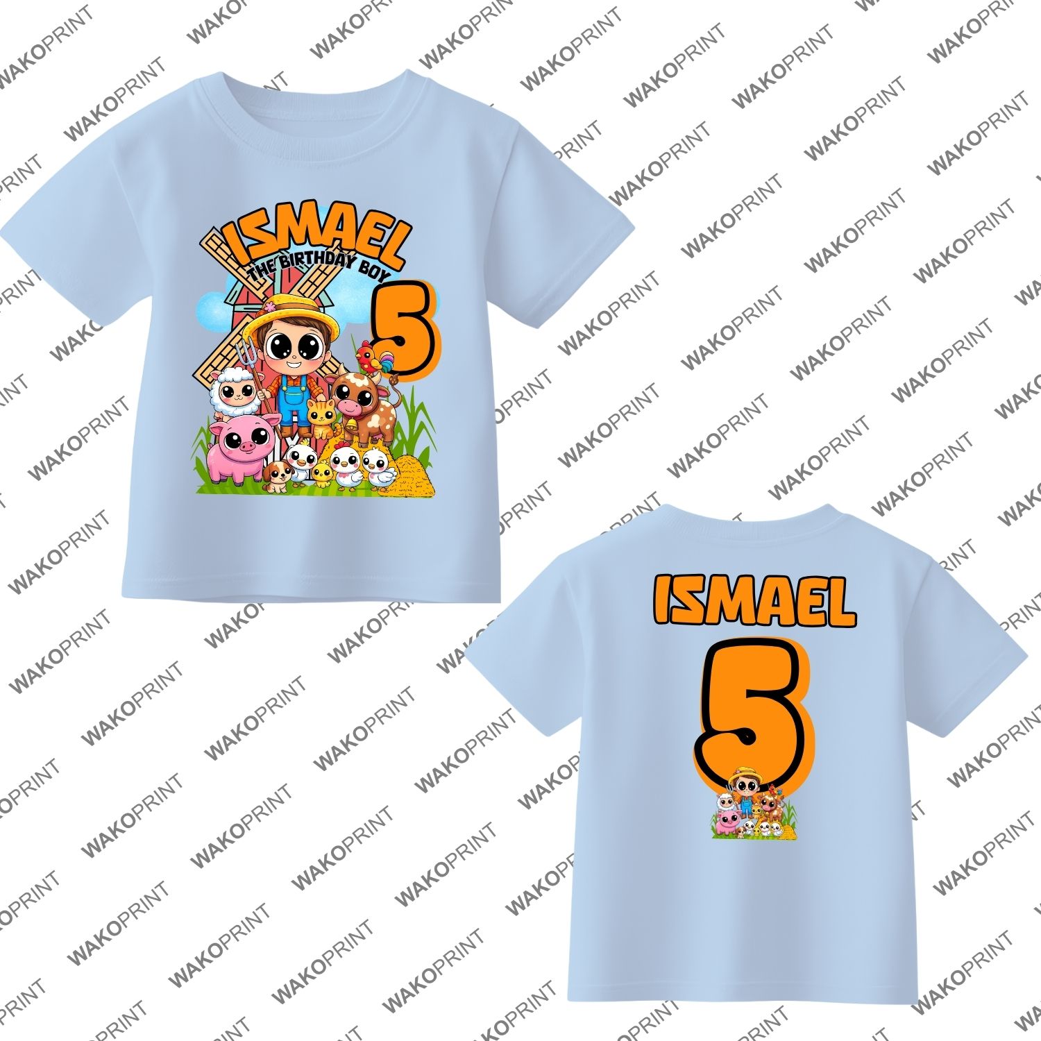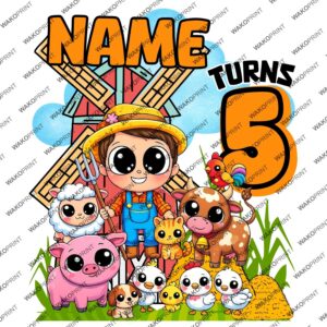 Celebrate your little one with this adorable farm themed birthday shirt featuring a cute birthday boy design surrounded by farm animals including pig cow sheep chicks and barnyard details. The shirt includes a custom name and age on the front, making it perfect for a farm birthday party celebration.