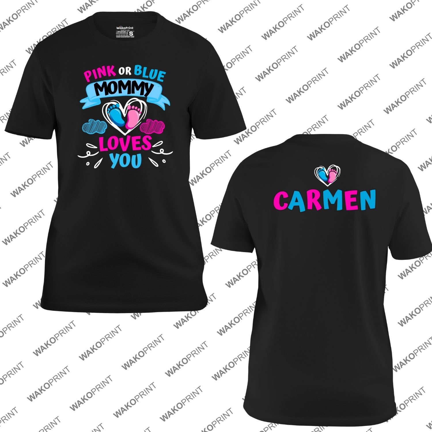 Personalized Gender Reveal T-Shirt | Pink or Blue Mommy Loves You | Custom Name on Back | Baby Shower Outfit | Black or White | Sizes 6M–4XL
