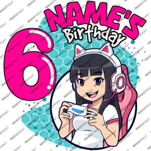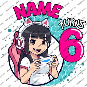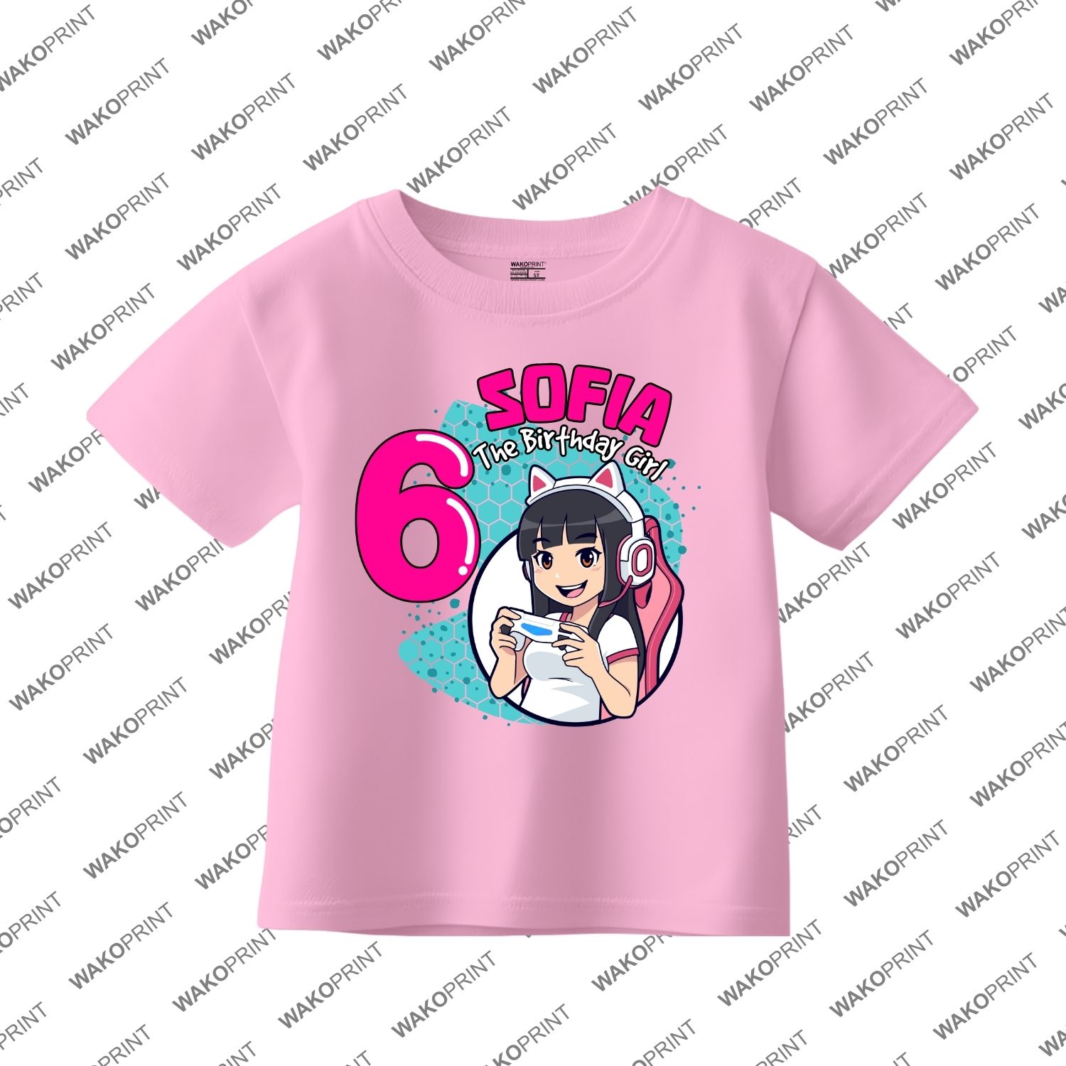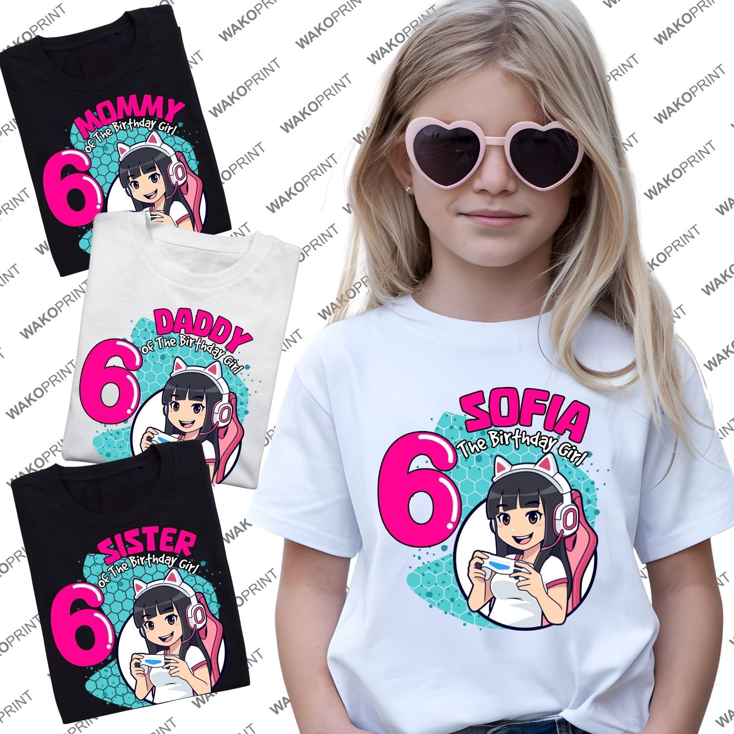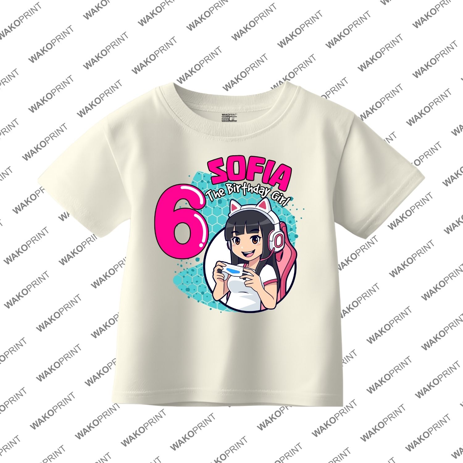 Personalized Gamer Girl Birthday Shirt | Custom Name and Age | Cute Anime Style Gamer Design | Add Text on Back 6M–4XL | Black White Natural Light Blue Pink