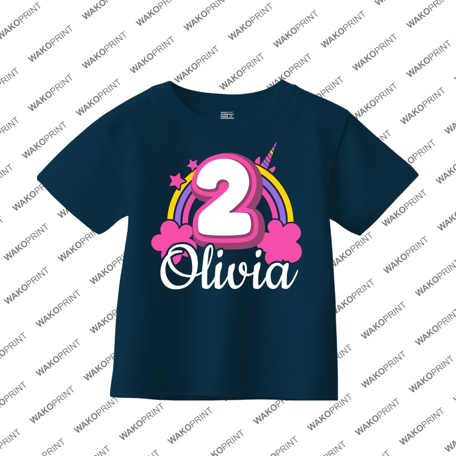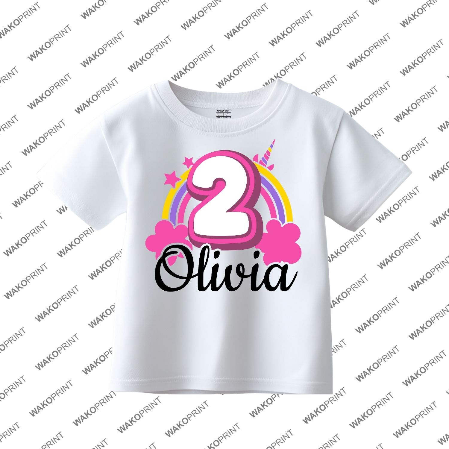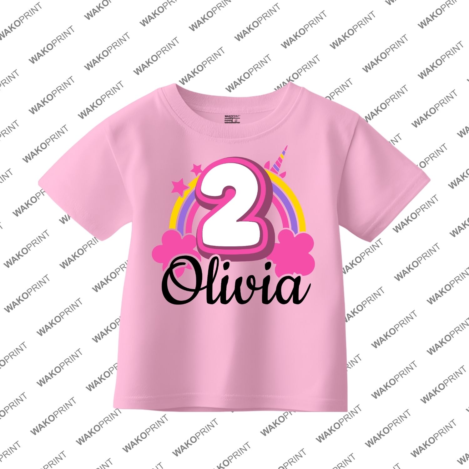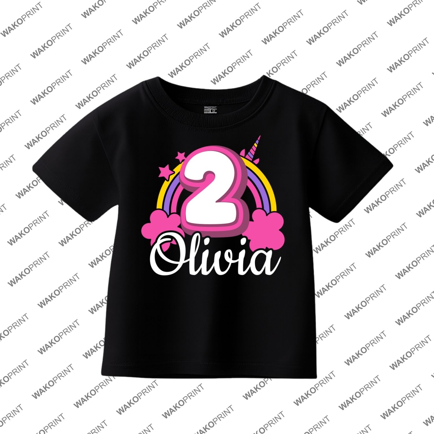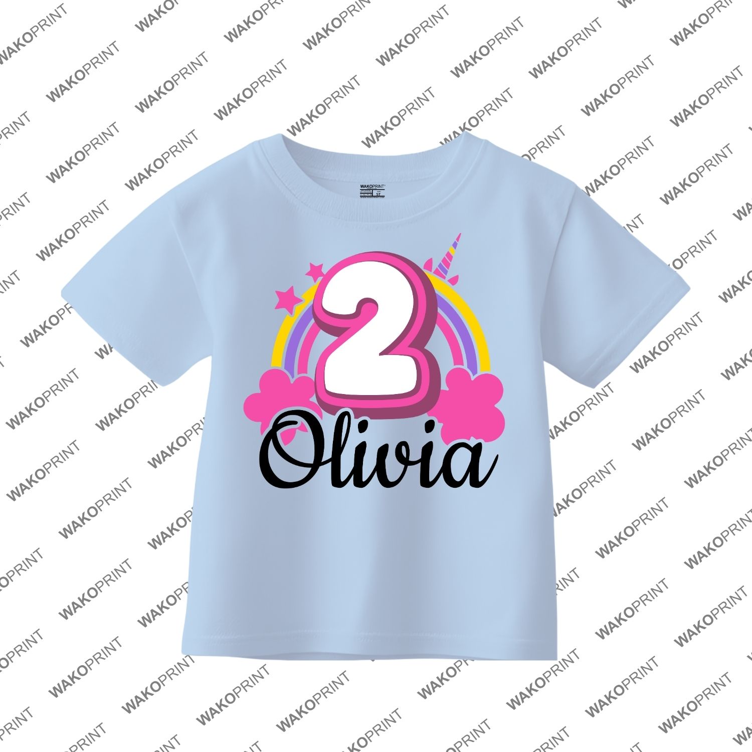 Home Kids Birthday Rainbow Birthday Girl Shirt | Personalized Name and Age Tee for Toddlers and Family | Unicorn Theme Matching Birthday Shirts | Sizes 6M–4XL | Black White Light Blue Natural Navy Pink