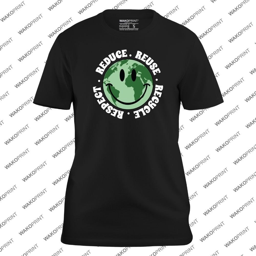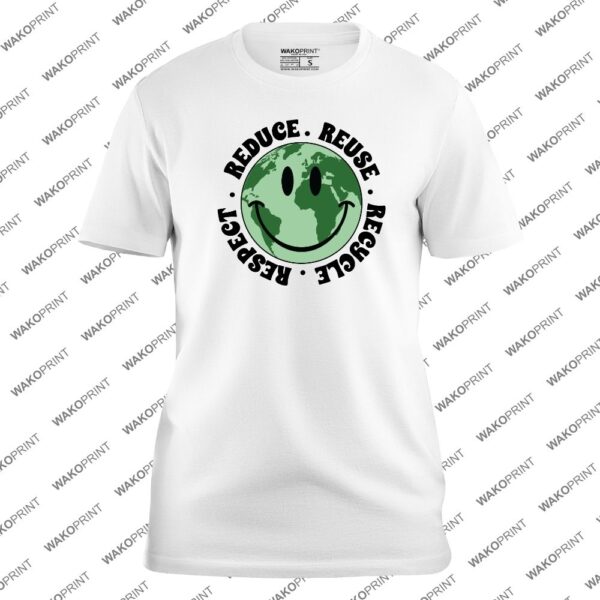 Reduce Reuse Recycle Respect T-Shirt – Eco Friendly Smiley Earth Graphic Tee, Environmental Awareness Shirt
