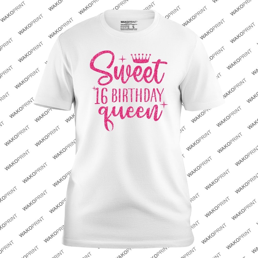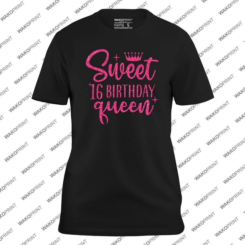 Sweet 16 Birthday Queen T-Shirt Glitter Pink Crown Party Tee for Girls
