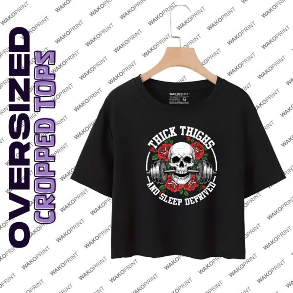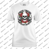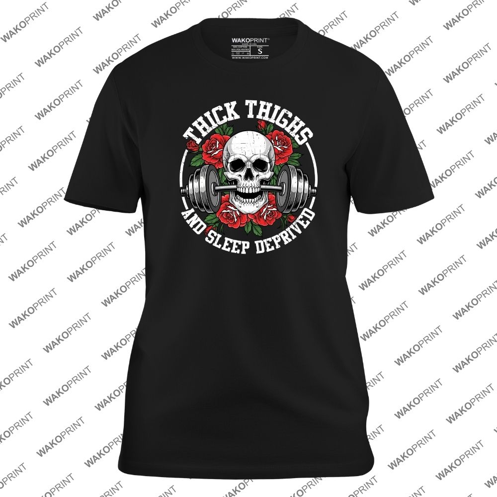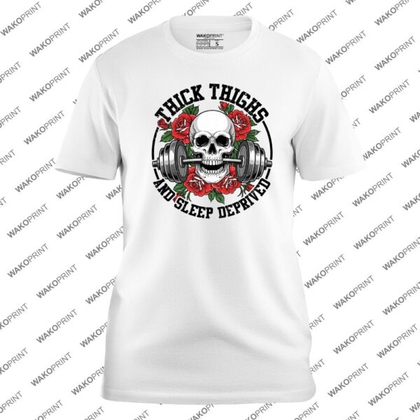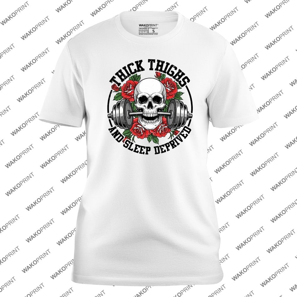 Thick Thighs and Sleep Deprived T-Shirt – Funny Skull Gym Fitness Weightlifting Tee for Men and Women