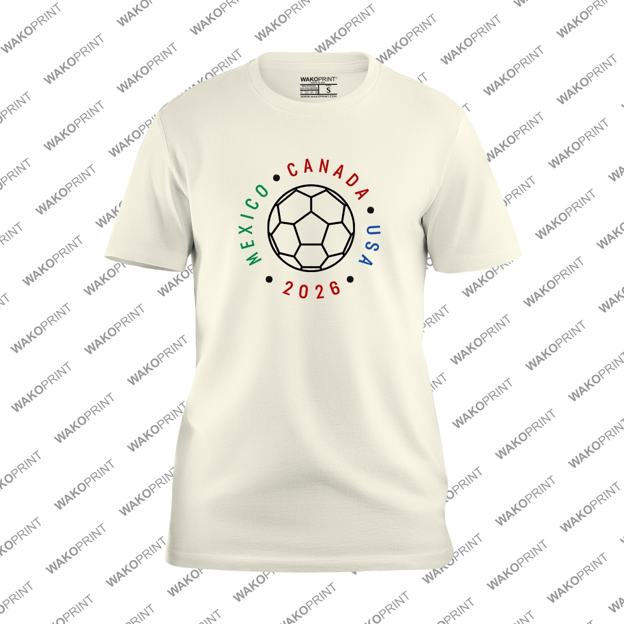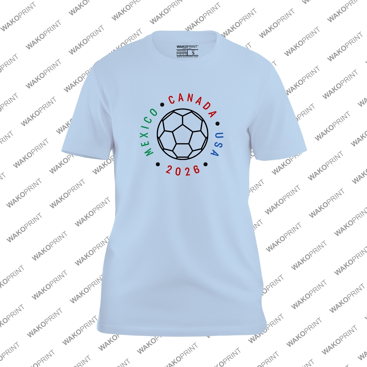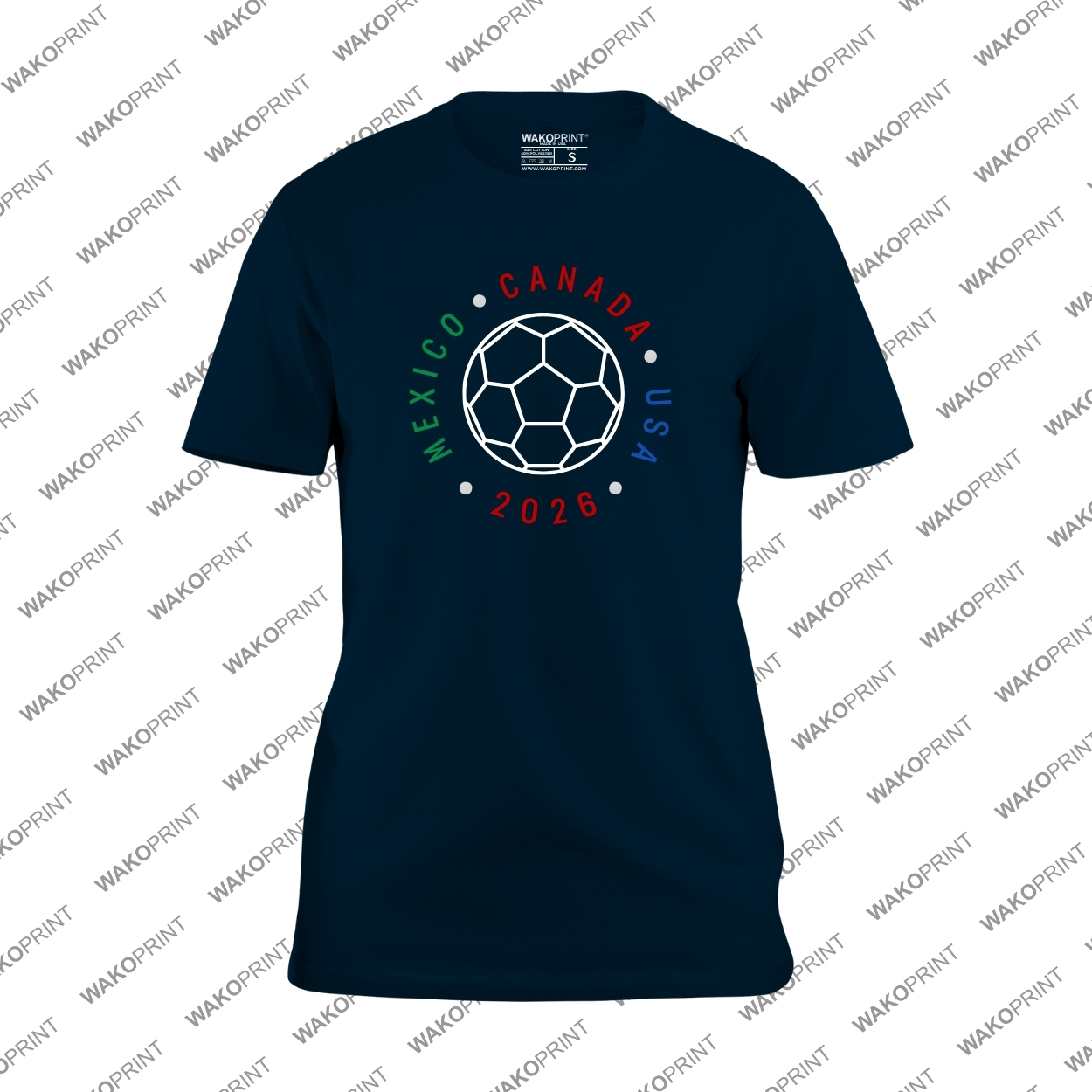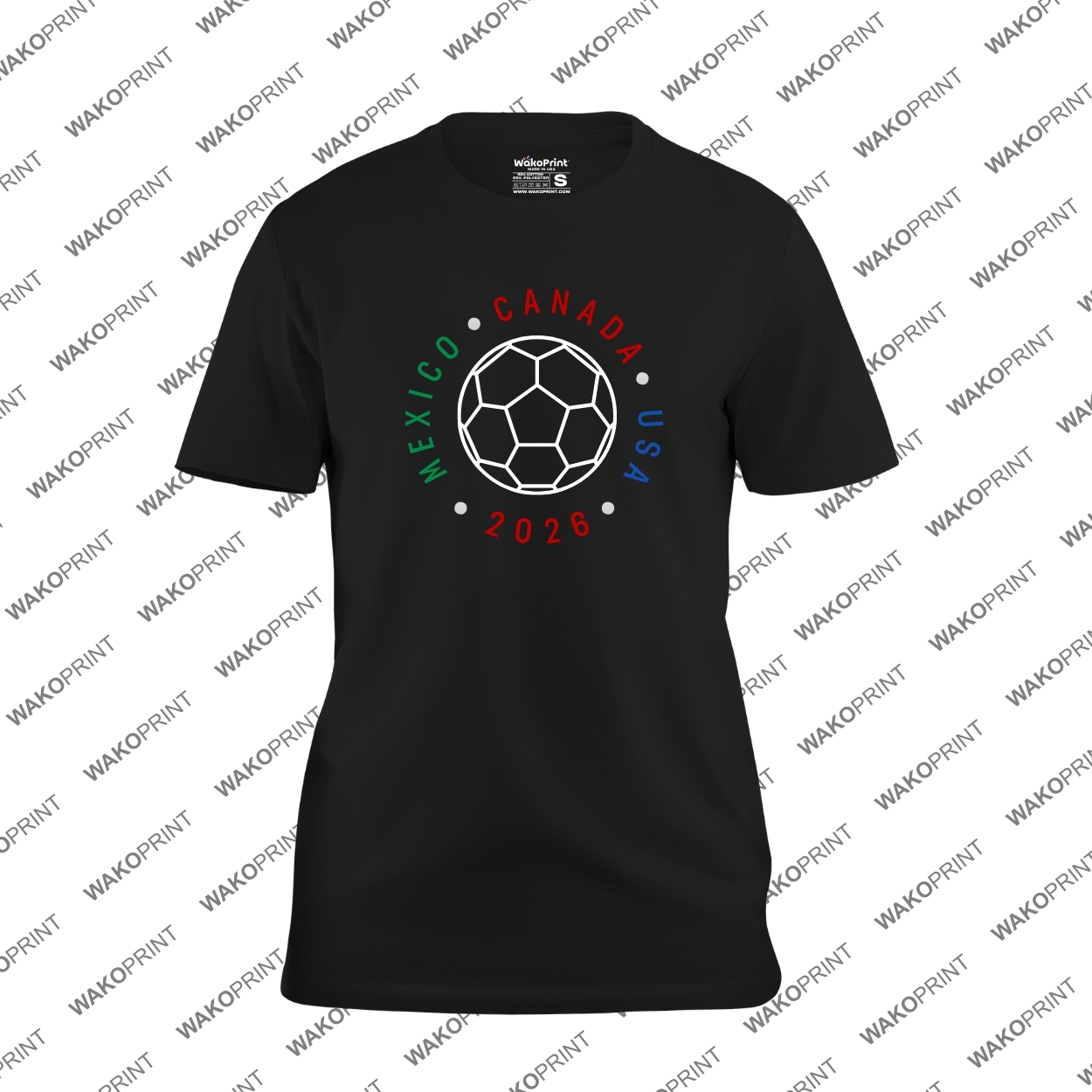 Celebrate the 2026 world soccer tournament with this bold international fan shirt featuring a classic soccer ball graphic surrounded by Mexico Canada USA and 2026 lettering. A clean modern design perfect for supporters of the three host countries and global football fans.
