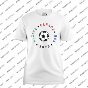 Celebrate the 2026 world soccer tournament with this bold international fan shirt featuring a classic soccer ball graphic surrounded by Mexico Canada USA and 2026 lettering. A clean modern design perfect for supporters of the three host countries and global football fans.